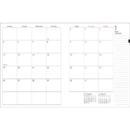 Ma Kokuyo non si ferma alla sola vista d'insieme. Accanto a ogni mese, trovi un'ampia e comoda pagina a righe, dedicata esclusivamente alle note. Questo spazio extra è perfetto per elaborare piani, scrivere liste di task, annotare riflessioni o tenere traccia dei tuoi progressi verso gli obiettivi mensili.