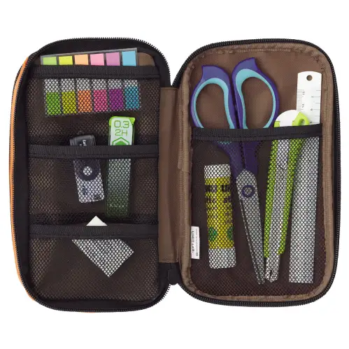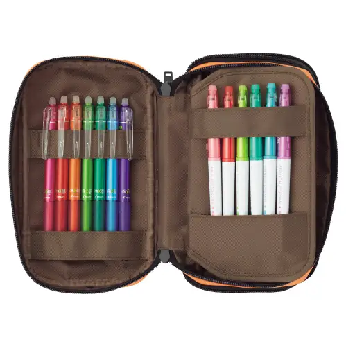 L’interno è suddiviso in due scomparti principali, dotati di elastici e tasche che permettono di organizzare penne, matite, evidenziatori e piccoli accessori in modo ordinato e facilmente accessibile. Il materiale esterno in tessuto tecnico garantisce durata e protezione, mentre le due zip assicurano praticità e sicurezza. Il colore arancione aggiunge un tocco di originalità e vitalità mantenendo un aspetto professionale.