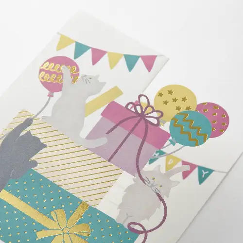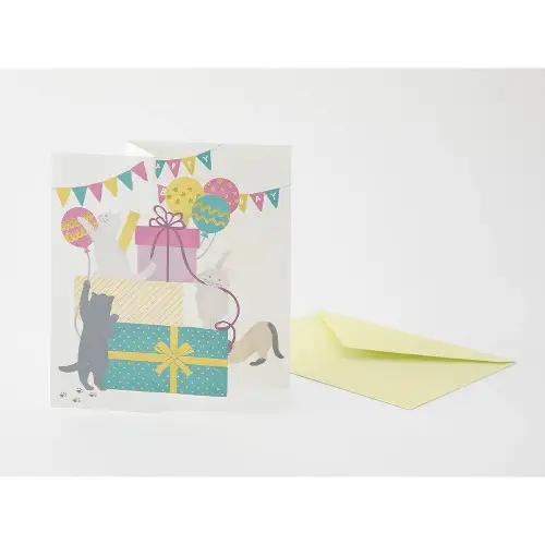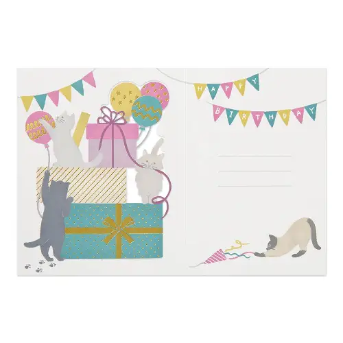 Questo biglietto d'auguri presenta un design a tripla piega che può essere leggermente aperto per stare in piedi, rendendolo perfetto per essere esposto. L'illustrazione tridimensionale raffigura un gatto che gioca con una pila di regali, ideale per le celebrazioni di compleanno. Il messaggio è nascosto quando il biglietto è verticale, invitando il destinatario a scoprirlo.