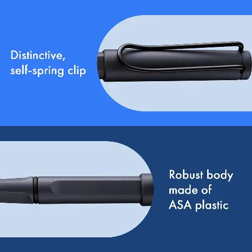 La Lamy Safari Steel Black fa parte della linea Safari, nota per il suo design iconico, robusto e leggero. Il corpo in resina ABS resistente garantisce durata, leggerezza e comfort di scrittura, mentre la finitura Steel Black conferisce alla penna uno stile moderno, elegante e sofisticato.