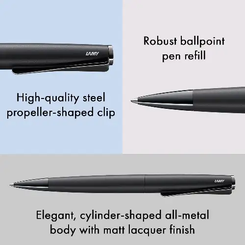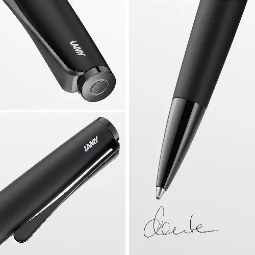 La Lamy Studio LX All Black è una penna a sfera realizzata in metallo di alta qualità, progettata per offrire solidità, equilibrio e comfort di scrittura. La finitura All Black in vernice nera opaca esalta il design essenziale e moderno della linea Studio LX.