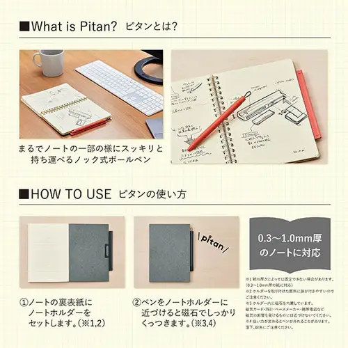 La penna che si integra perfettamente con il tuo quaderno, come se ne fosse una parte naturale. PITAN è una penna a gel retrattile dotata di un supporto magnetico che si fissa alla copertina posteriore. Basta avvicinare la penna al supporto e i magneti la tengono saldamente ancorata. Un design intelligente e minimalista per portare sempre penna e taccuino insieme, senza ingombri e senza cercare.