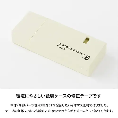 Questo nastro correttore Midori utilizza materiali biomass per ridurre l’impatto ambientale: il corpo, la struttura interna e il film di rilascio sono realizzati in 51% carta e 49% PP, rendendo il prodotto smaltibile come rifiuto combustibile.