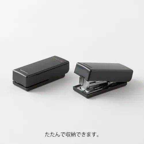Questa pinzatrice compatta è stata riprogettata per essere ancora più piccola e portatile, misurando 48,2 mm di lunghezza, 19,7 mm di larghezza e 13,6 mm di profondità, risultando circa il 30% più compatta rispetto alla versione precedente. Nonostante le dimensioni ridotte, mantiene caratteristiche fondamentali come la possibilità di piegarsi per una conservazione compatta, un levapunti integrato e un indicatore per controllare la posizione dei punti, oltre alla capacità di pinzare fino a 10 fogli di carta da copia.