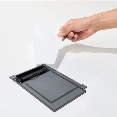 Tira la parte superiore verso l’alto e fai scorrere la guida sopra il foglio: il sistema dividerà il foglio in quattro parti uguali (formato A6).