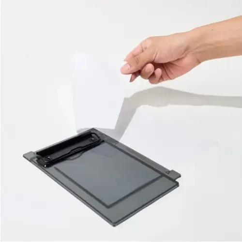 Posiziona il foglio A4 sotto la guida del portablocco, allineandolo con le tacche previste.