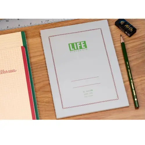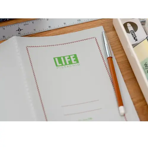 Notebook Life Company Life Pistachio in formato A5 con fogli a quadretti verdi da 5 mm, cucito e compatto. Ideale per appunti ordinati, studio, lavoro o scrittura creativa. La carta bianca offre una scrittura confortevole e nitida.
