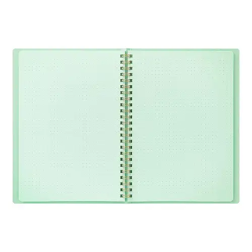 Questo notebook a spirale di Midori unisce estetica e praticità: copertina e pagine interne sono realizzate entrambe in carta colorata, così puoi scegliere il contrasto carta‑penna che preferisci. Il layout a griglia puntinata (dot grid 5 mm) fornisce una guida discreta per scrivere, disegnare o organizzare layout, senza risultare invadente.