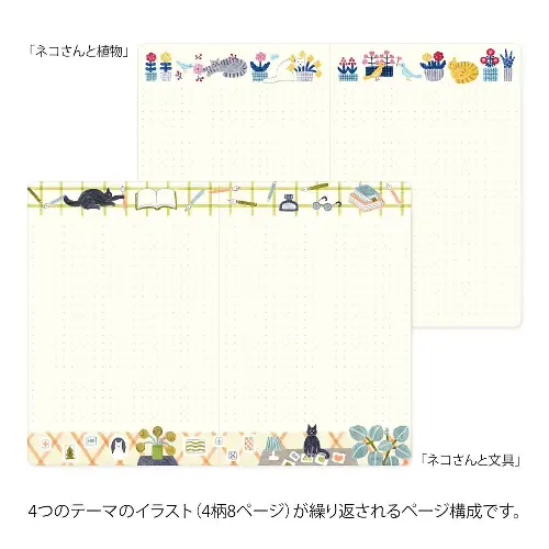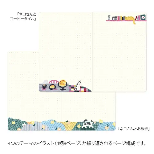 • Illustrazioni originali di Kumiko Horibe: disegni di gatti in 4 temi: passeggiata, caffè, cartoleria e piante.