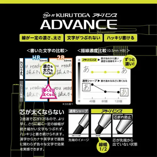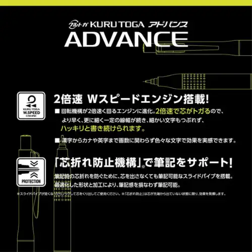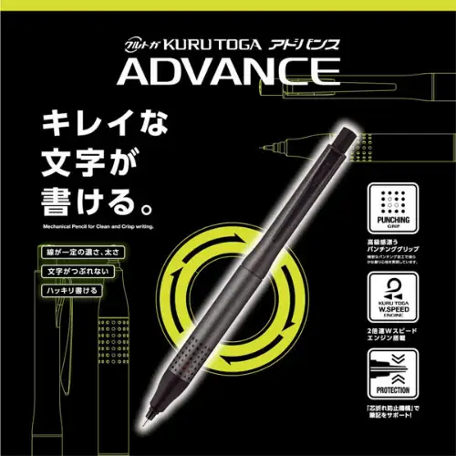 L'evoluzione definitiva della serie Kurutoga, ora con corpo in metallo. Questo modello "Advance Upgrade" rappresenta il top di gamma della tecnologia a rotazione automatica della mina, combinando il motore W Speed a doppia velocità con una costruzione raffinata e robusta. L'impugnatura in metallo con microfori (punching grip) garantisce una presa salda, mentre il design low-center gravity assicura stabilità e comfort durante la scrittura.