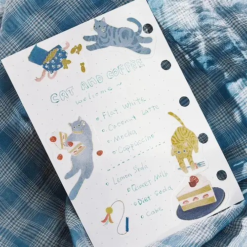 Le Flake Seal BGM “Kitten Café * Blueberry” aggiungono un tocco dolce e giocoso ai tuoi progetti creativi. Il set comprende 15 design diversi, con 3 copie ciascuno per un totale di 45 pezzi, tutti decorati con adorabili gattini e dettagli ispirati all’atmosfera di un café, impreziositi da tonalità fresche e delicate al mirtillo.