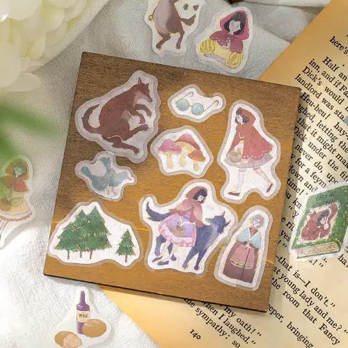 Set di adesivi decorativi (flake seal) ispirati alla fiaba di Cappuccetto Rosso. Ogni sticker racconta un piccolo frammento della storia: la piccola con il cappuccio rosso, il lupo, la nonna, il cacciatore, il cestino, la casa nel bosco e dettagli incantati. Ideali per aggiungere un tocco di fiaba e avventura a bullet journal, scrapbooking e progetti creativi.