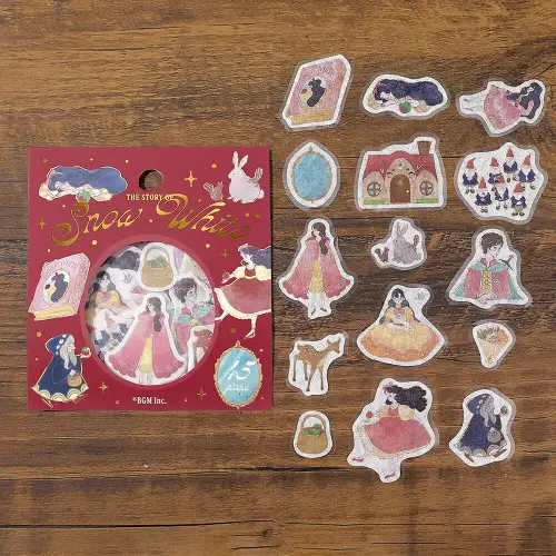 Set di adesivi decorativi (flake seal) ispirati alla fiaba di Biancaneve. Ogni sticker racconta un piccolo frammento della storia: la principessa, i sette nani, la mela avvelenata, il principe, il castello, la foresta incantata e dettagli magici. Ideali per aggiungere un tocco di fiaba e incanto a bullet journal, scrapbooking e progetti creativi.