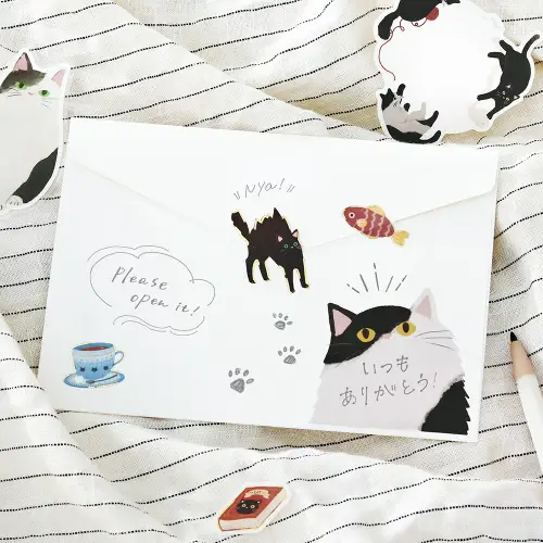 Set di adesivi memo (memo seal) a tema gatto, nella tonalità nera (kuro). Ogni foglio contiene piccole note adesive con illustrazioni di gattini neri e scene in stile “cat diary”, accompagnate da righe e spazi per scrivere appunti. Ideali per aggiungere un tocco elegante e sofisticato a bullet journal, planner, diari e messaggi personali.