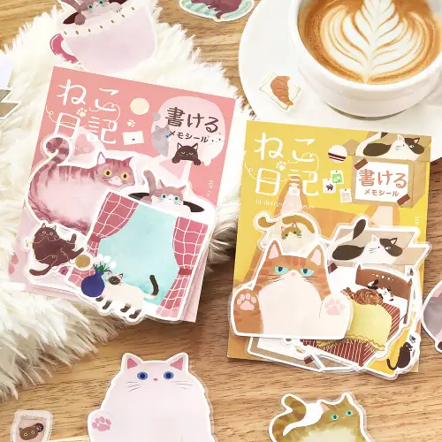 Set di adesivi memo (memo sticker) a tema gatto, in calda tonalità gialla. Ogni foglio contiene piccole note adesive con illustrazioni di gattini in scene quotidiane, insieme a righe e spazi per scrivere appunti. Ideali per aggiungere un tocco dolce e organizzato a bullet journal, planner, diari e messaggi personali.