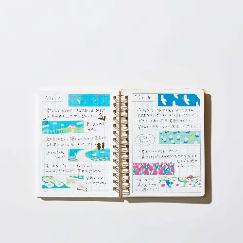La collezione KITTA COLLAGE, parte della linea HITOTOKI di King Jim, offre un modo pratico ed elegante per decorare quaderni e progetti creativi. Questo pratico libretto combina nastri washi pretagliati con un foglio di adesivi in PET trasparente con dettagli foil, con un design paesaggistico ricco di profondità illustrato da Nodoka Miyashita. Il suo formato permette l'uso senza forbici e garantisce una finitura pulita e brillante grazie ai dettagli foil.