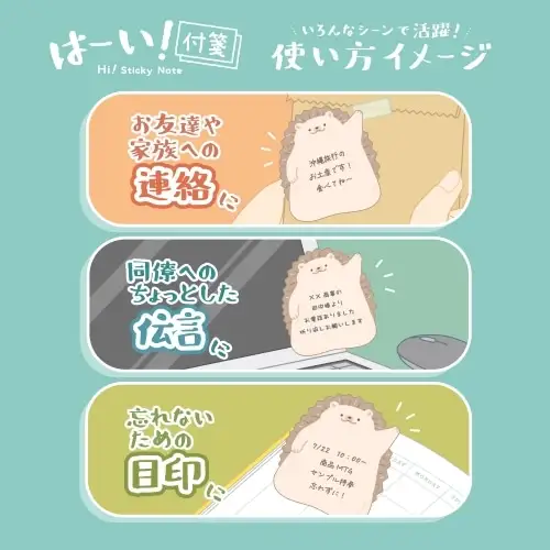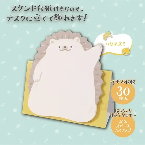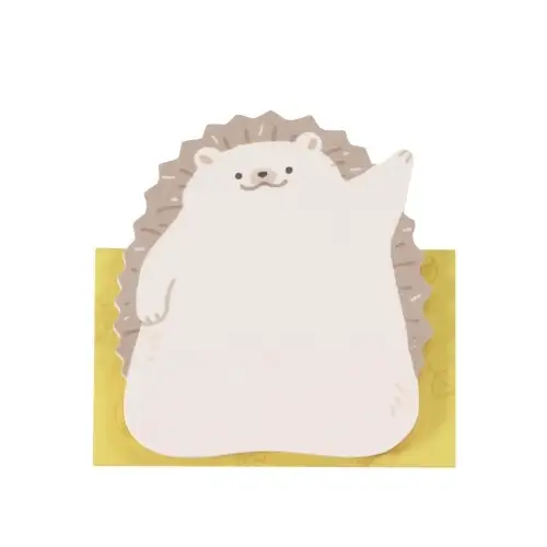 Le Hai! Sticky Notes Hedgehog di Kutsuwa sono blocchetti adesivi composti da 30 foglietti raffiguranti simpatici ricci che alzano la zampa per salutare. Ideali per appunti, memo e decorazioni da scrivania, combinano praticità e tenerezza.