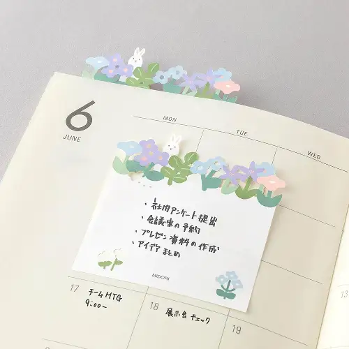 Queste note adesive presentano un intricato design fustellato che raffigura un dettagliato paesaggio floreale, con un coniglio che fa capolino dal giardino fiorito come elemento centrale. I loro colori brillanti e affascinanti le rendono ideali per un uso informale e creativo .