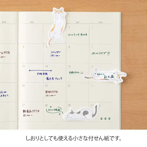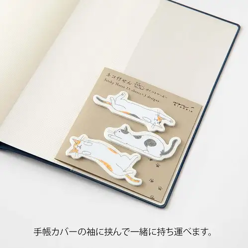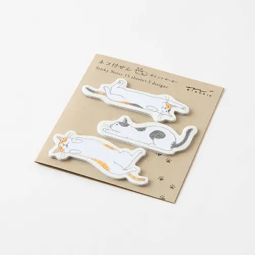 Queste piccole note adesive, illustrate da Sayo Koizumi, una disegnatrice amante dei gatti, presentano un tenero micio che si stiracchia, perfetto per essere usato come indice in quaderni e organizer. Lo spazio sulla pancia del gatto permette di scrivere appuntamenti, rendendolo ideale anche come pagina di agenda. Il supporto pieghevole si inserisce nella tasca della copertina, rendendo facile portarle insieme al tuo diario o planner.