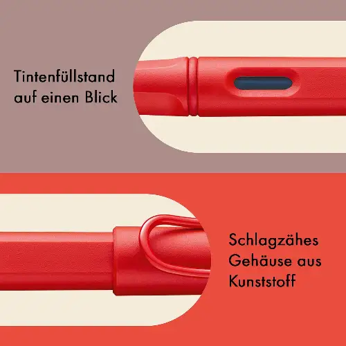 La Safari presenta inoltre una finestra per controllare il livello d’inchiostro, una clip a molla cromata e un design robusto che rende la penna pratica e resistente. Compatibile con cartucce Lamy T10 o con convertitore Z28 (non incluso).