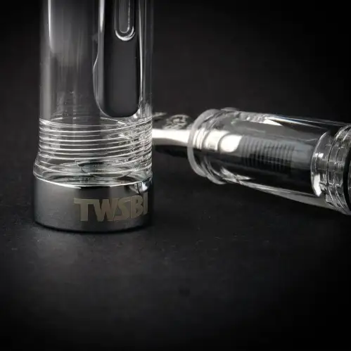 • Corpo totalmente trasparente: canna e sezione di presa in plastica trasparente di alta qualità. Il cappuccio e il fondello sono esagonali e realizzati in plastica trasparente lucida, con finiture cromate a specchio e il logo TWSBI in plastica rossa incastonato sulla sommità.
