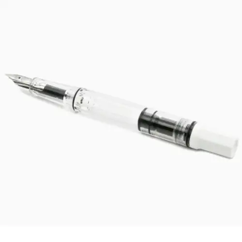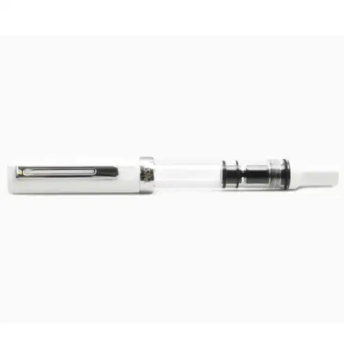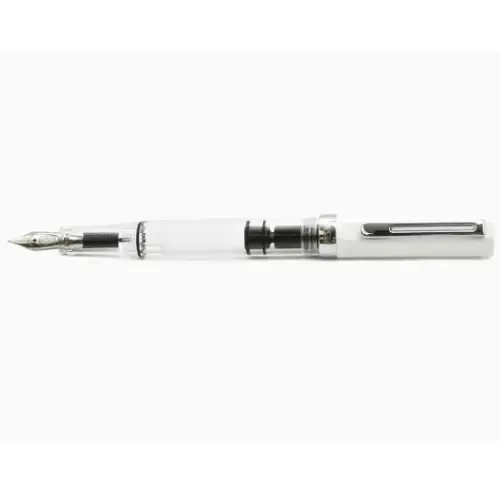 • Corpo trasparente con dettagli bianco lucido: canna e impugnatura in resina trasparente di alta qualità, cappuccio e fondello in plastica bianca lucida. Finiture cromate specchiate e logo TWSBI rosso sulla sommità.