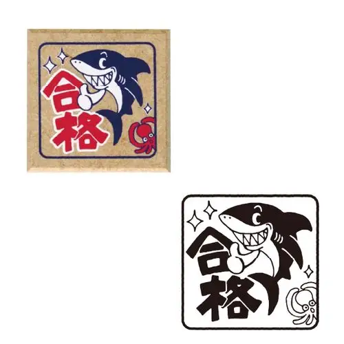 Timbro tradizionale in legno della serie "Mori no Hanko ya Teacher" (il laboratorio del maestro di timbri della foresta), con illustrazioni originali del celebre artigiano giapponese dei timbri umoristici, "Mori no Hankoyasan". Il timbro riporta la scritta "Pass!" accompagnata dalle simpatiche illustrazioni di uno squalo e un polpo, ideale per valutare i compiti con un tocco allegro e originale o per decorare agende e quaderni.
