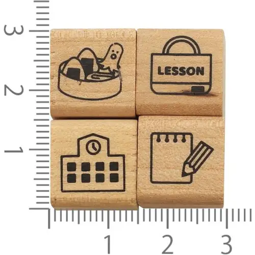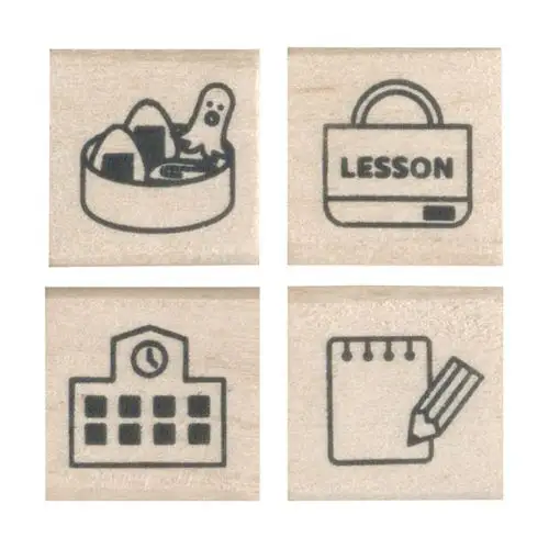 Set di 4 timbri tradizionali con manico in legno, appartenente alla serie “Notebook Stamp Club” (手帳はんこ部) di Kodomo no Kao. Il set a tema “School” include quattro motivi legati al mondo scolastico: zaino, astuccio, libro e lavagna (o altri elementi didattici). Ideale per decorare bullet journal, agende e quaderni con un tocco tematico e originale.