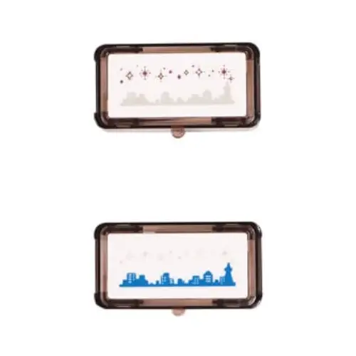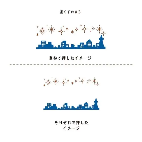 Questo affascinante timbro giapponese raffigura uno skyline di città circondato da esplosioni di stelle, perfetto per decorare diari, planner, biglietti e scrapbooking con un look scintillante e kawaii.