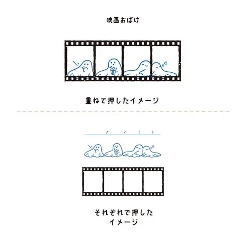 Questo simpatico timbro giapponese raffigura un fantasmino tra pellicole e ciak cinematografici — perfetto per decorare diari, planner, biglietti e scrapbooking con un tocco giocoso e un po’ spooky.