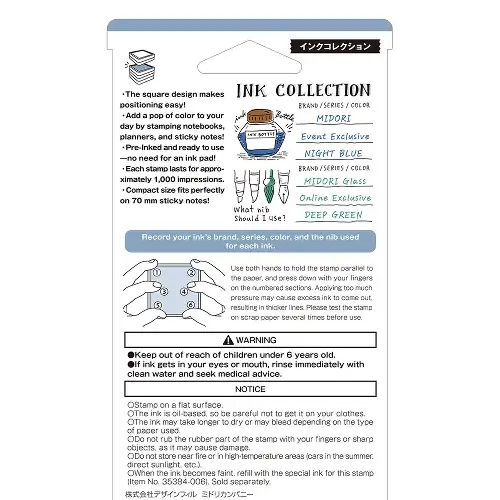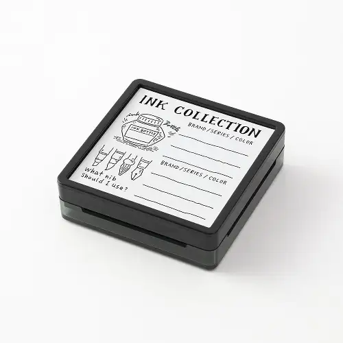 Registra e organizza la tua collezione di inchiostri con stile. Questo timbro pre-inchiostrato presenta un design esclusivo "Ink Collection", inizialmente a edizione limitata e ora riproposto per i mercati internazionali. Perfetto per appassionati di fountain pen, permette di annotare in modo chiaro ed elegante marche, serie, colori e pennini ideali dei tuoi inchiostri preferiti.