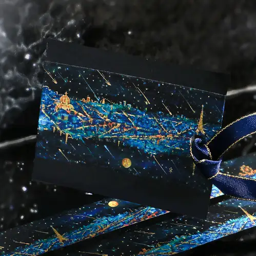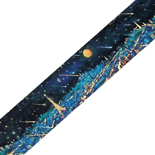 Illumina i tuoi progetti con la magia di una notte stellata. Questo nastro washi della serie "Night of shooting stars" cattura l'incanto di un cielo notturno solcato da stelle cadenti, arricchito da delicati dettagli in foil-stamped che brillano come piccole luci. Perfetto per aggiungere un tocco di sogno, romanticismo e splendore sottile a ogni tua creazione.