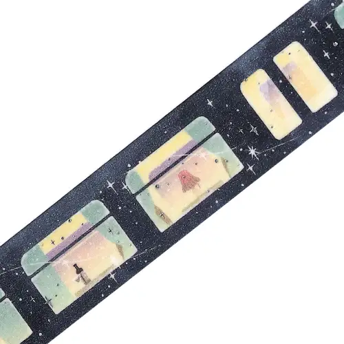 Nastro washi decorativo con un motivo onirico e suggestivo: un treno che viaggia silenzioso tra le stelle, attraversando paesaggi notturni illuminati da luna e costellazioni. Perfetto per aggiungere un tocco di magia e nostalgia ai tuoi progetti creativi, bullet journal, scrapbooking e decorazioni.