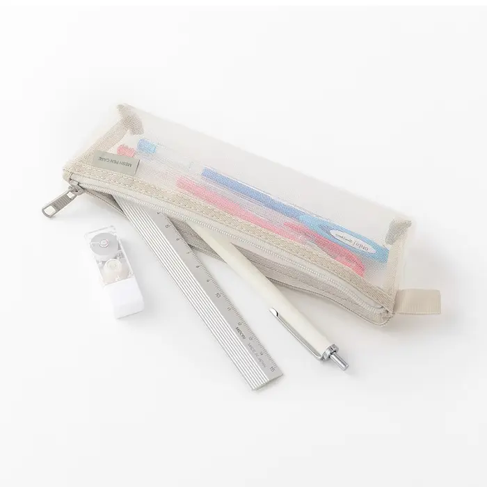 Un astuccio essenziale, leggero e trasparente. Realizzato in rete di nylon, permette di vedere il contenuto a colpo d’occhio, mentre la base con soffietto offre uno spazio sorprendente per penne, evidenziatori e piccoli oggetti di cancelleria. La scelta pratica per organizzare il necessario in borsa, nello zaino o sulla scrivania.