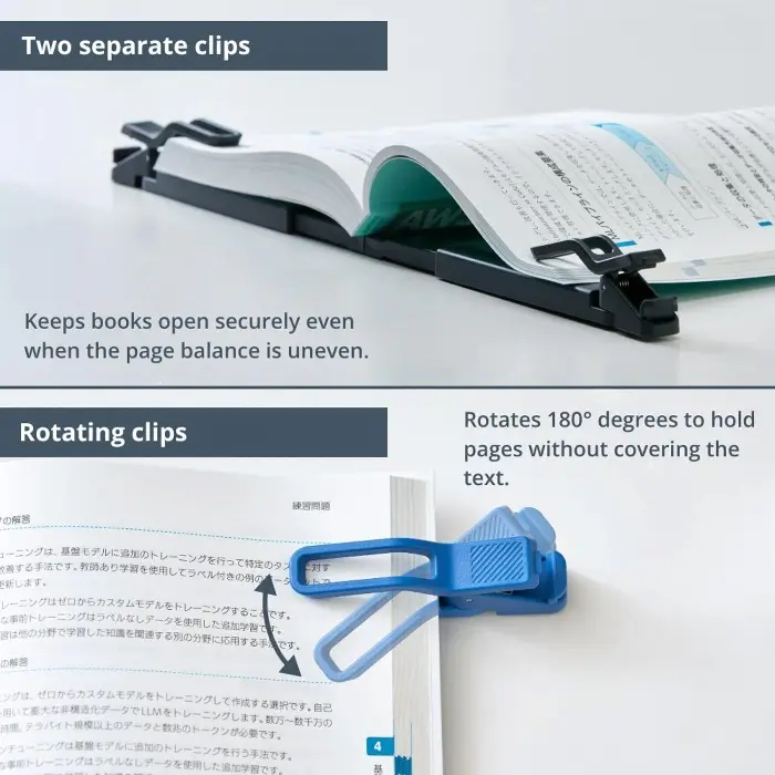 • Due clip separate e girevoli per bloccare meglio ciascun lato del libro.