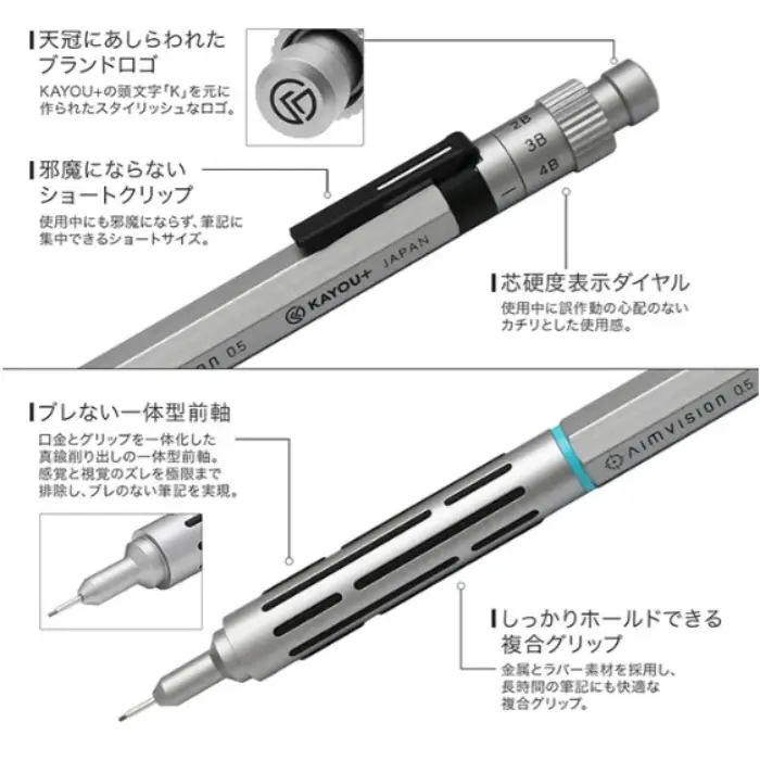 Precisione e stabilità al servizio della scrittura tecnica. L'Aimvision è una matita meccanica pensata per offrire un'esperienza di disegno e scrittura senza vibrazioni, grazie a un corpo anteriore interamente ricavato da un blocco unico di ottone. Il suo design a basso baricentro e la struttura rigida garantiscono un controllo assoluto, trasformando ogni tratto in un gesto naturale e preciso.