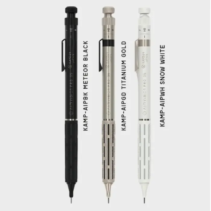 La massima espressione della matita meccanica da disegno, realizzata interamente in ottone lavorato al CNC. L'Aimvision Pro è il modello di punta della nuova linea KAYOU+, progettato per offrire rigidità, stabilità e precisione assolute, riducendo al minimo vibrazioni e rumori durante la scrittura. La finitura "Titanium Gold" conferisce un aspetto caldo e luminoso, mentre l'impugnatura combinata (zigrinatura metallica + gomma) assicura una presa salda e confortevole anche nelle sessioni più lunghe.
