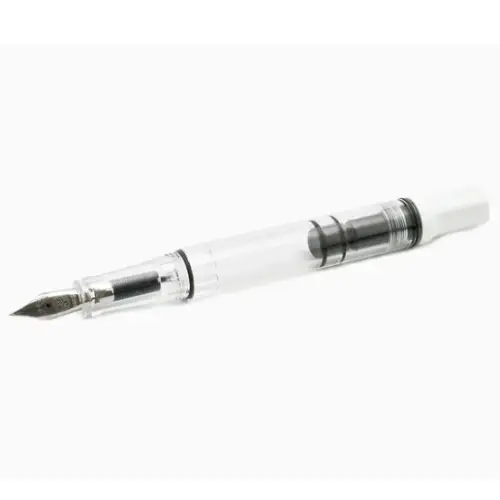 • Corpo trasparente con dettagli bianco lucido: canna e impugnatura in resina trasparente di alta qualità, cappuccio e fondello in plastica bianca lucida. Finiture cromate specchiate e logo TWSBI rosso sulla sommità.