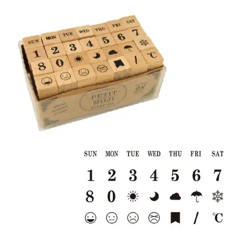 • Set di timbri in legno con giorni della settimana, numeri e simboli.