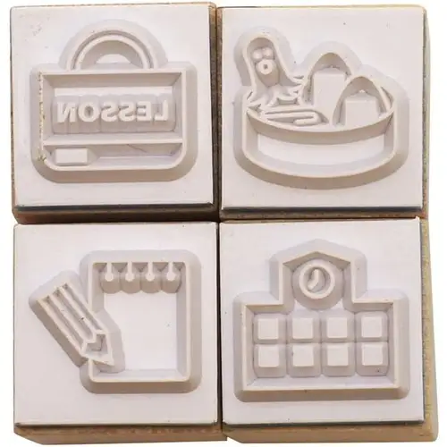 Set di 4 timbri tradizionali con manico in legno, appartenente alla serie “Notebook Stamp Club” (手帳はんこ部) di Kodomo no Kao. Il set a tema “School” include quattro motivi legati al mondo scolastico: zaino, astuccio, libro e lavagna (o altri elementi didattici). Ideale per decorare bullet journal, agende e quaderni con un tocco tematico e originale.