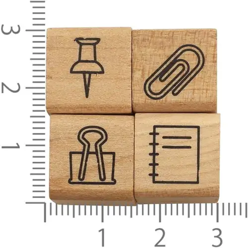 • Set da 4 timbri con manico in legno, tema “stationery” (cancelleria).