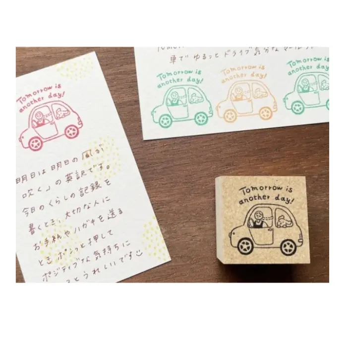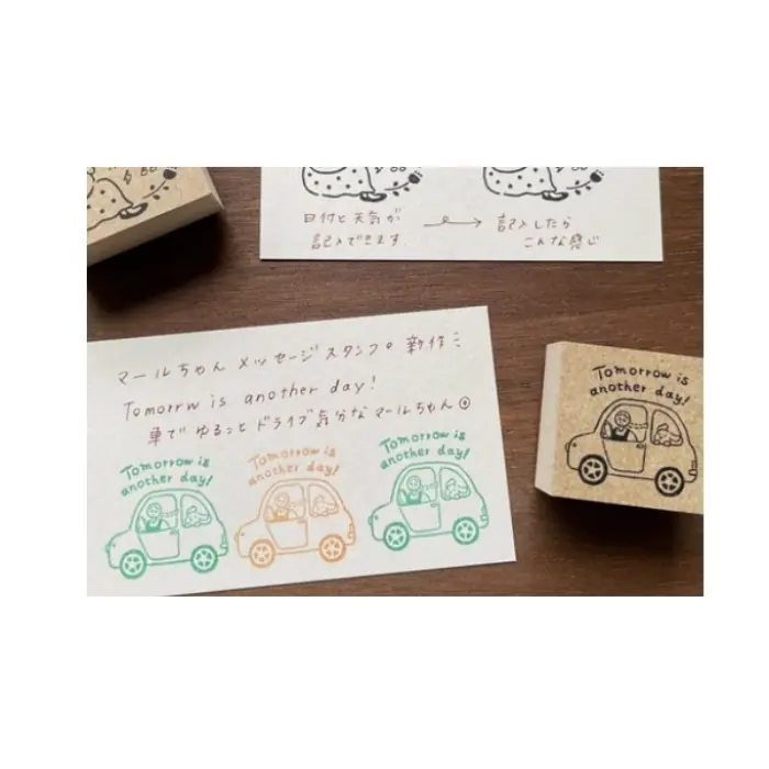 Timbro in gomma naturale su manico in legno con l’illustrazione della mascotte Merle‑chan (マールちゃん), il personaggio simbolo di Stamp Marche. Il timbro riporta la scritta “Tomorrow is another day!” accompagnata dalla frase giapponese “明日は明日の風が吹く” (“il vento di domani soffierà domani”), un messaggio di fiducia e serenità verso il futuro. Ideale per decorare planner, bullet journal, agende e quaderni con un tocco poetico e positivo.