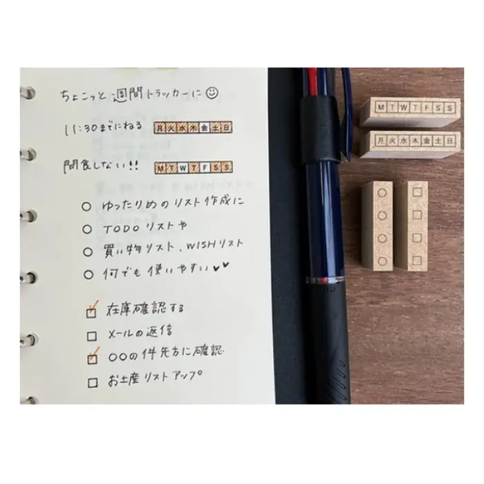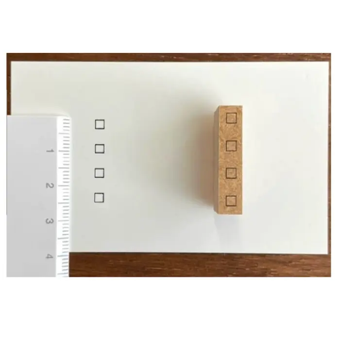 Timbro in gomma naturale su manico in legno che permette di inserire liste di cose da fare negli spazi ristretti del taccuino. L'impronta è composta da quattro caselle di controllo quadrate da 2,5 mm disposte in fila, con uno spazio vuoto tra l'una e l'altra. La dimensione è studiata per adattarsi perfettamente ai quaderni a quadretti come Hobonichi Techo. Basta timbrare e spuntare le caselle per tenere traccia dei propri impegni quotidiani.