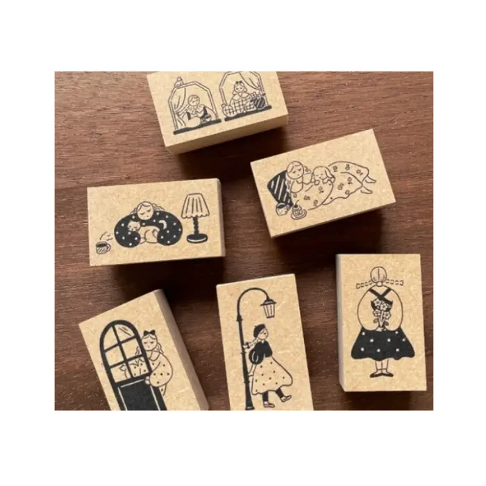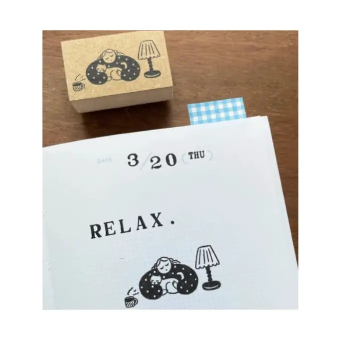 Timbro in gomma su manico in legno che raffigura la mascotte di Stamp Marche, la ragazza Marl-chan, mentre sonnecchia dolcemente abbracciata a un gatto. Sul tavolo accanto, una tazza di caffè fumante e una lampada accesa completano la scena, creando un’atmosfera calda e accogliente, perfetta per raccontare momenti di relax trascorsi in casa.
