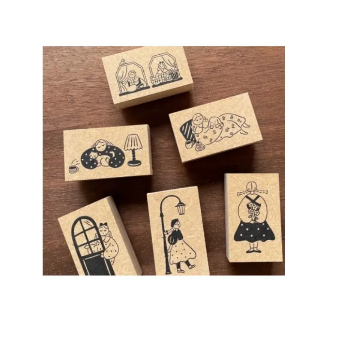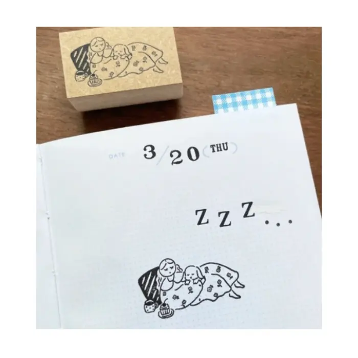 Timbro in gomma su manico in legno che raffigura la mascotte di Stamp Marche, Marl-chan, che si rilassa con un coniglio: appoggiata a un cuscino, si concede un momento di dolcezza con uno spuntino. Il tema "Pajama Time" evoca l’atmosfera accogliente e intima di un pomeriggio in casa, perfetto per raccontare momenti di tranquillità o per aggiungere un tocco di tenerezza a pagine di diario e planner.